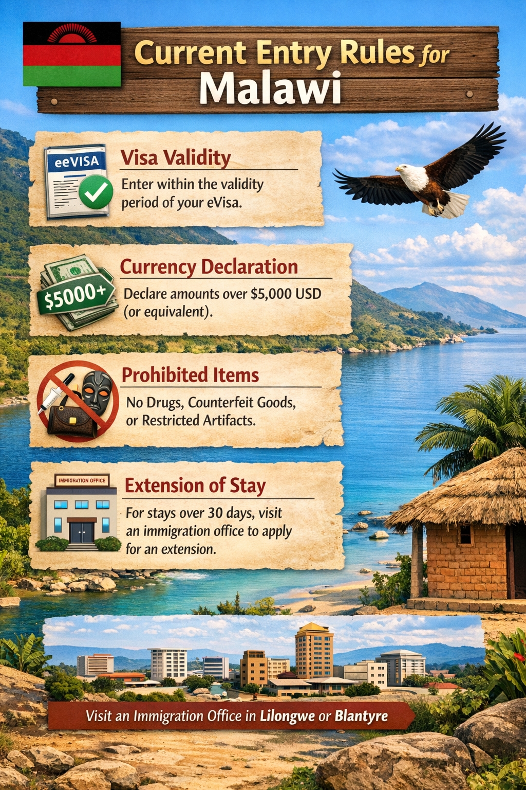 Extension of Stay: If you wish to stay longer than 30 days, you must visit an immigration office in a major city (like Lilongwe or Blantyre) to apply for a visitor's permit extension.