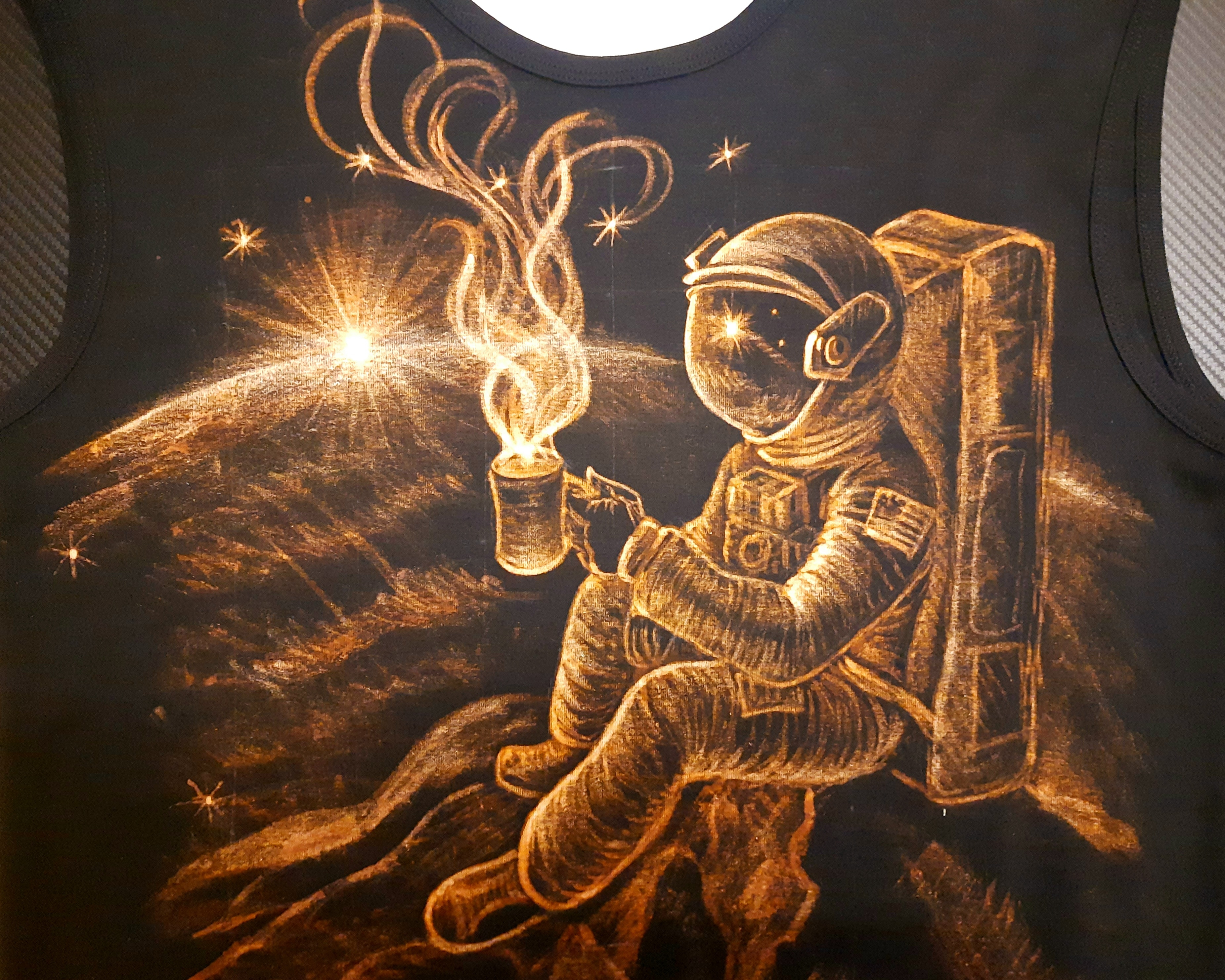 До речі, якщо хочете замовити кастомний розпис, можете зі мною зв'язатися й отримати новорічну знижку -20% за промокодом “007”. Це може бути не лише футболка, а й худі, адже зараз холодна пора. Ми з вами узгодимо ескіз і я виконаю розпис на ваше замовлення. Кошти з цих замовлень я витрачу на підтримку свого чоловіка, котрий служить у війську і потребує зігріваючих речей.