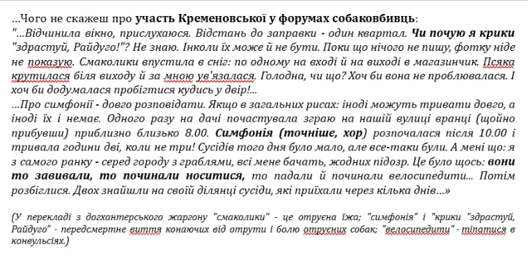 В цьому контексті стає зрозумілим, чому саме #Кременовська в Україні стала натхненною поплічницею Дворкіна та агенткою його структури РАЦИРС, афілійованої з ФСБ. Адже вона так само отримувала задоволення від тривалих страждань безневинних собак, яких вона особисто пригощала “смаколиками” (тобто отрутою) на вулицях міст. А собаки це перший крок. Далі ті, хто отримує задоволення від смерті тварин, зазвичай переходять на людей.