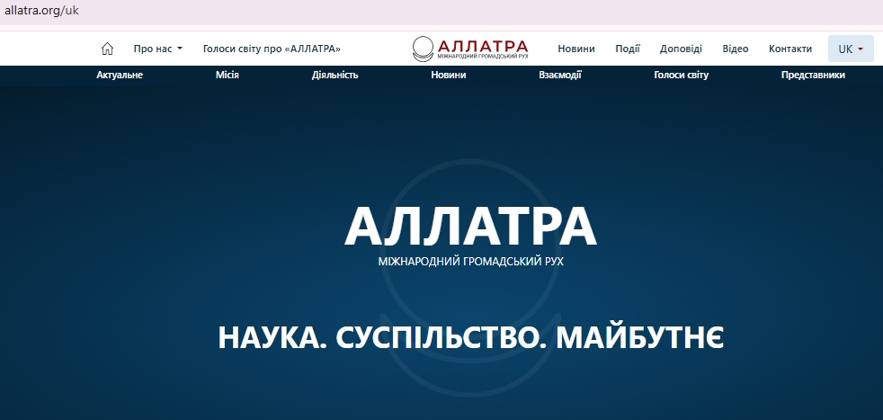 І не потрібно у своїх бідах звинувачувати АЛЛАТРА, яку поважає весь демократичний світ. Її надважлива діяльність щодо вивчення кліматичних та геодинамічних змін, впливу нанопластику на людину та планету визнається як ООН, так і Ватиканом. АЛЛАТРА вибудовує мости, які з’єднують науку, політику, релігію та громадянське суспільство з метою побудови сталого майбутньогодля всього людства.