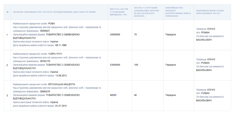 Так, формально керівництво передано іншим людям (наприклад, ТОВ «Рома» продовжує керувати дружина Клічука – Лариса, яка поєднує медичну практику з бізнесом у сфері алкогольної дистрибуції), проте фінансовий контроль залишається.