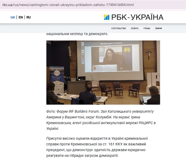 Під час міжнародного форуму у Вашингтоні на території католицького університету Америки на IRF Builders Forum, де були присутні високопосадовці США та міжнародні експерти, заявили, що під виглядом антикультових кампаній у різних країнах діє мережа, якою керує фсб із москви. Саме через цю антикультову мережу росія роками створює медіа атаки на населення демократичних країн, вербує агентів через завербованих псевдоекспертів, втручається у законодавство країн, розпалює ворожнечу в суспільстві та підриває демократію.