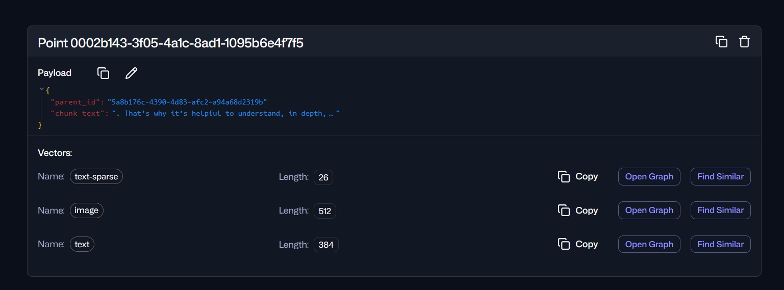 Qdrant є мультимодальним сховищем, може зберігати текст та медіафайли. У фан проекті я векторизувала власні Notion помітки у локальний Qdrant, це хороший спосіб розпочати вивчення векторних сховищ з малими даними. Професійний підхід - це розгортання сховища на контейнері як сервіс, який потім можна оркеструвати або розгорнути через aws чи gcp.