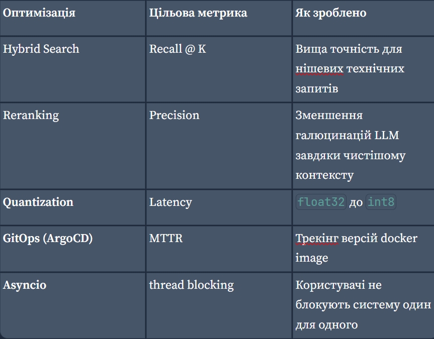 Асинхронне виконання (asyncio): асинхронність для Qdrant та FastAPI для обробки одночасних запитів кількох користувачів без блокування основного потоку.