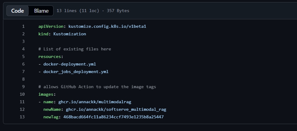 kubectl get pod -l app=rag-api -o jsonpath='{.items[0].spec.containers[0].image}'Оновлення тегу у kustomization.yml не буде застосовано, якщо образ взятий не з реєстру, а, наприклад, з докеру: