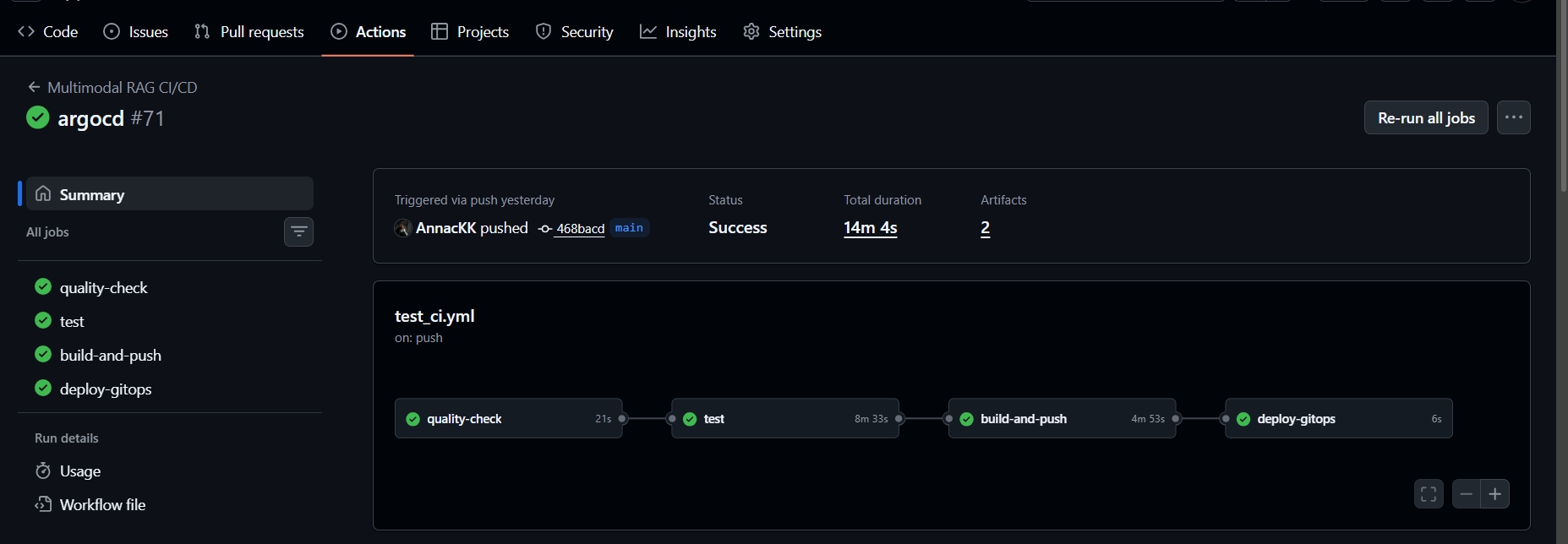 Під час локальної оркестрації використовується image з локальної колекції докера image: docker.io/collections/multimodal-rag:latest, яке оновлюється тільки при docker compose, але ніяк не вписується у концепції CI/CD. Для завантаження оновленого image після push потрібно посилатись на реєстр контейнерів GHCR: image: ghcr.io/annackk/multimodalrag:latest.