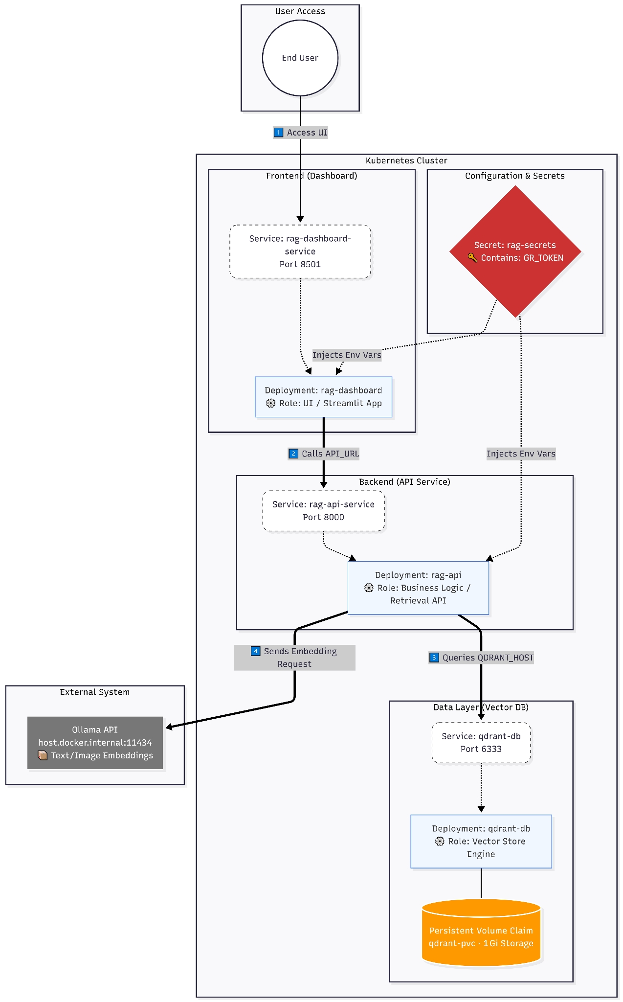 GR_TOKEN,QDRANT_HOST) та секрети для горизонтального масштабування.Container Healthcheck: трафік надходить до API лише після того, як контейнери готові.