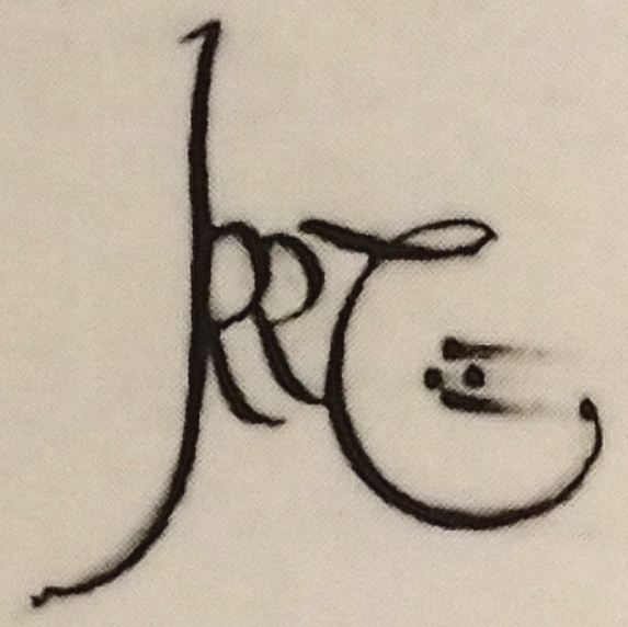 Вперше Толкін використав монограму ще в далекому 1906 році, у скетчі «Lyme Regis Harbor from the Drawing Room Window of the Cups Hotel», простим поєднанням літер свого імені: «J», «R» і «T». Доволі логічно, чи не так? Цікаво, що на той час майбутньому автору було лише 14 років, доволі юний вік, однак любов до символізму та якогось самовираження прокинулась вже тоді.