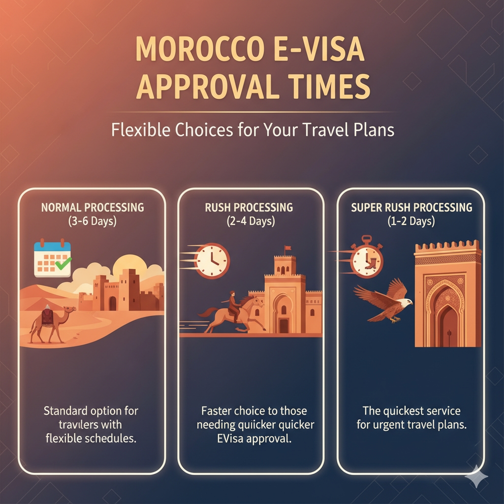 Super Rush Processing (1–2 Days): The quickest service for urgent travel plans, ensuring the Morocco eVisa is approved in the shortest possible time.