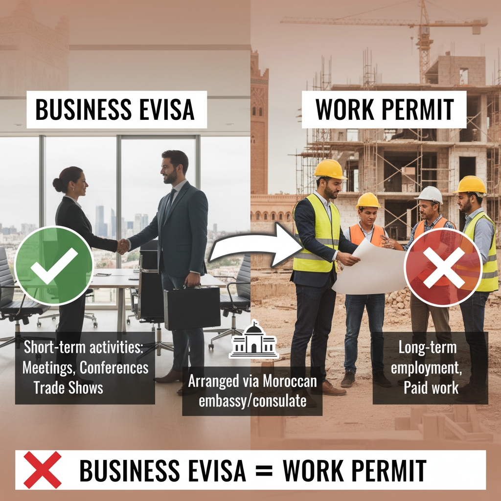 No — the business eVisa for Morocco is not a work permit. It allows certain short-term business activities (meetings, conferences, trade shows) but does not allow paid employment or long-term work in Morocco.