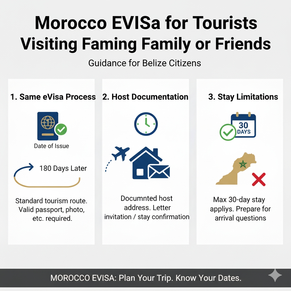 If you’re a Belize citizen travelling to Morocco to visit family or friends rather than purely on a sightseeing holiday, the process is fundamentally the same as the standard tourism route under the Morocco eVisa. Many of the same conditions (valid passport, photo, proof of arrival/departure, accommodation or host details, etc) apply.