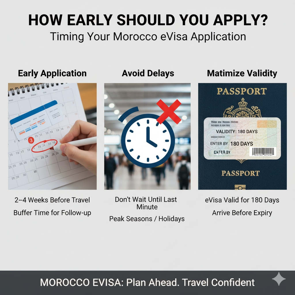 While the application framework for the Morocco eVisa allows for relatively quick processing, the general recommendation is to apply as early as possible — ideally a few weeks before your departure. According to briefs, the maximum validity for many eVisas is 180 days from issue, yet arrival into Morocco must happen within that window.