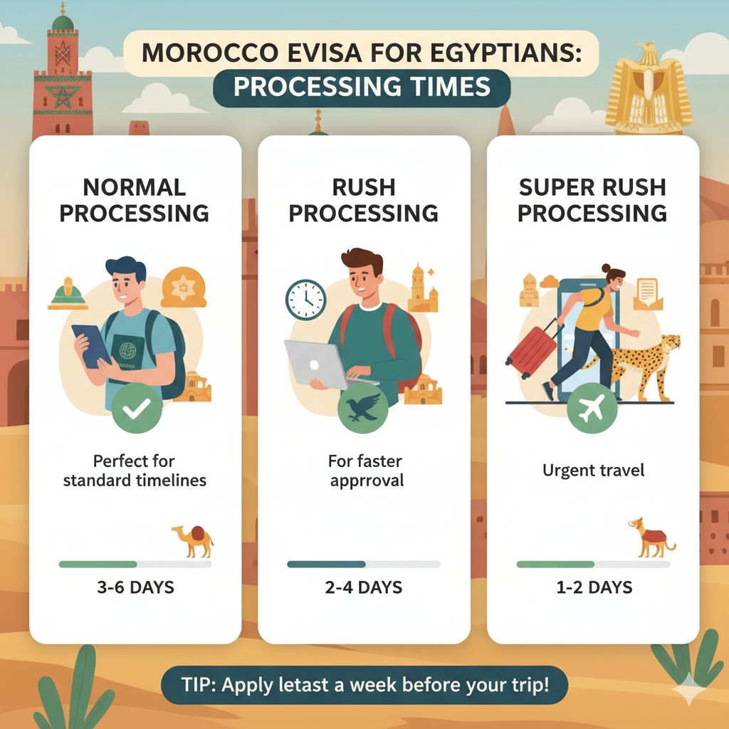 Typical terms for Egyptian citizens applying for a Morocco eVisa are as follows: