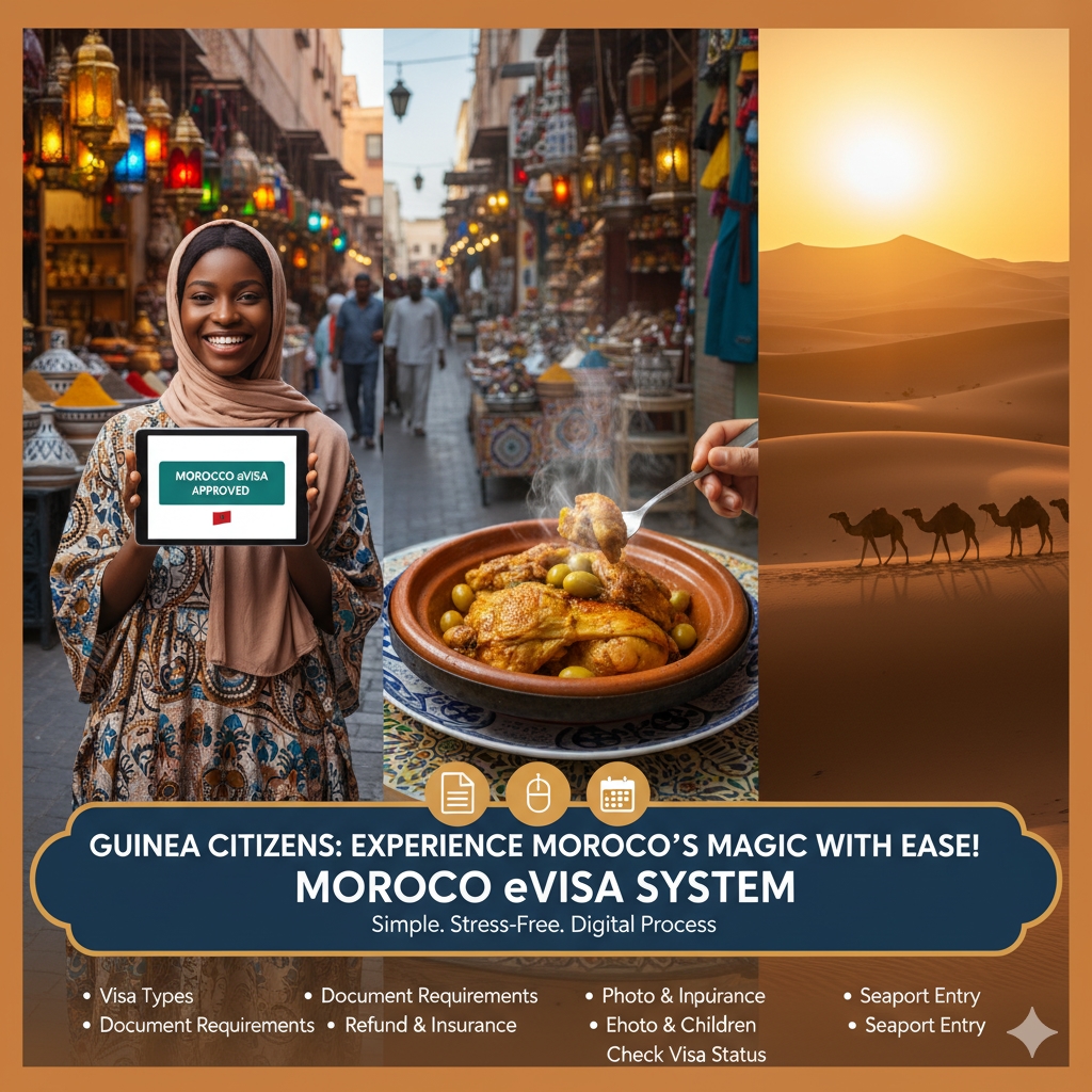 This guide covers everything you need to know about the Morocco eVisa for Guinea, including visa types, document requirements, processing times, refund and reapplication policies, photo and insurance guidelines, eVisa for children, seaport entry rules, and how to check your visa status.