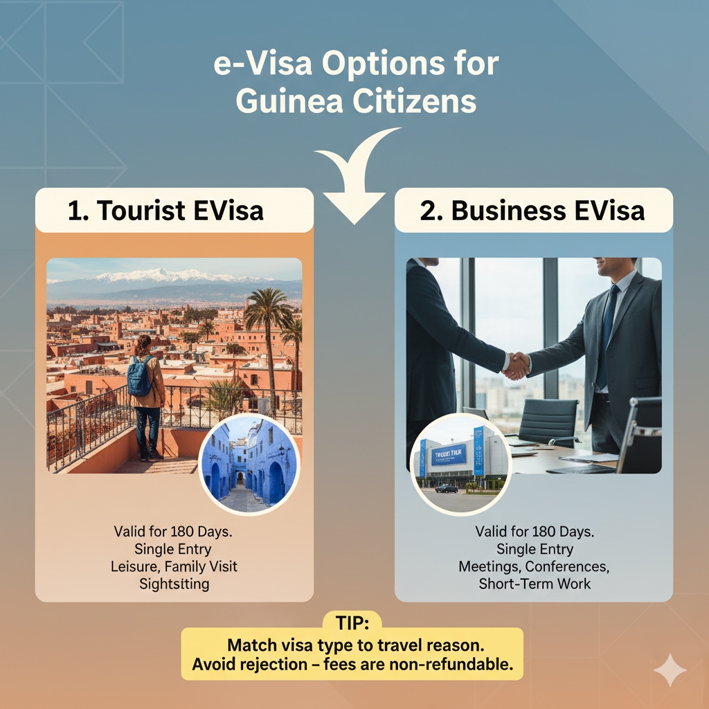 When you begin your online application, the first step is choosing your visa type. Morocco offers two main categories for Guinea Citizens:
