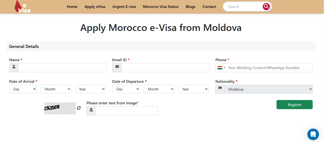 Visit the Morocco eVisa application site. Choose your nationality as Moldova and the purpose of your visit.