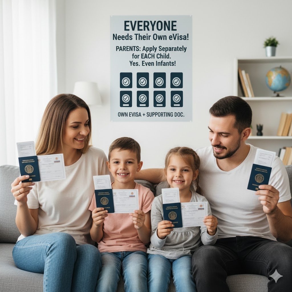 Yes. This is a critical rule that many families miss. Every single traveler, regardless of age, must have their own separate eVisa application.