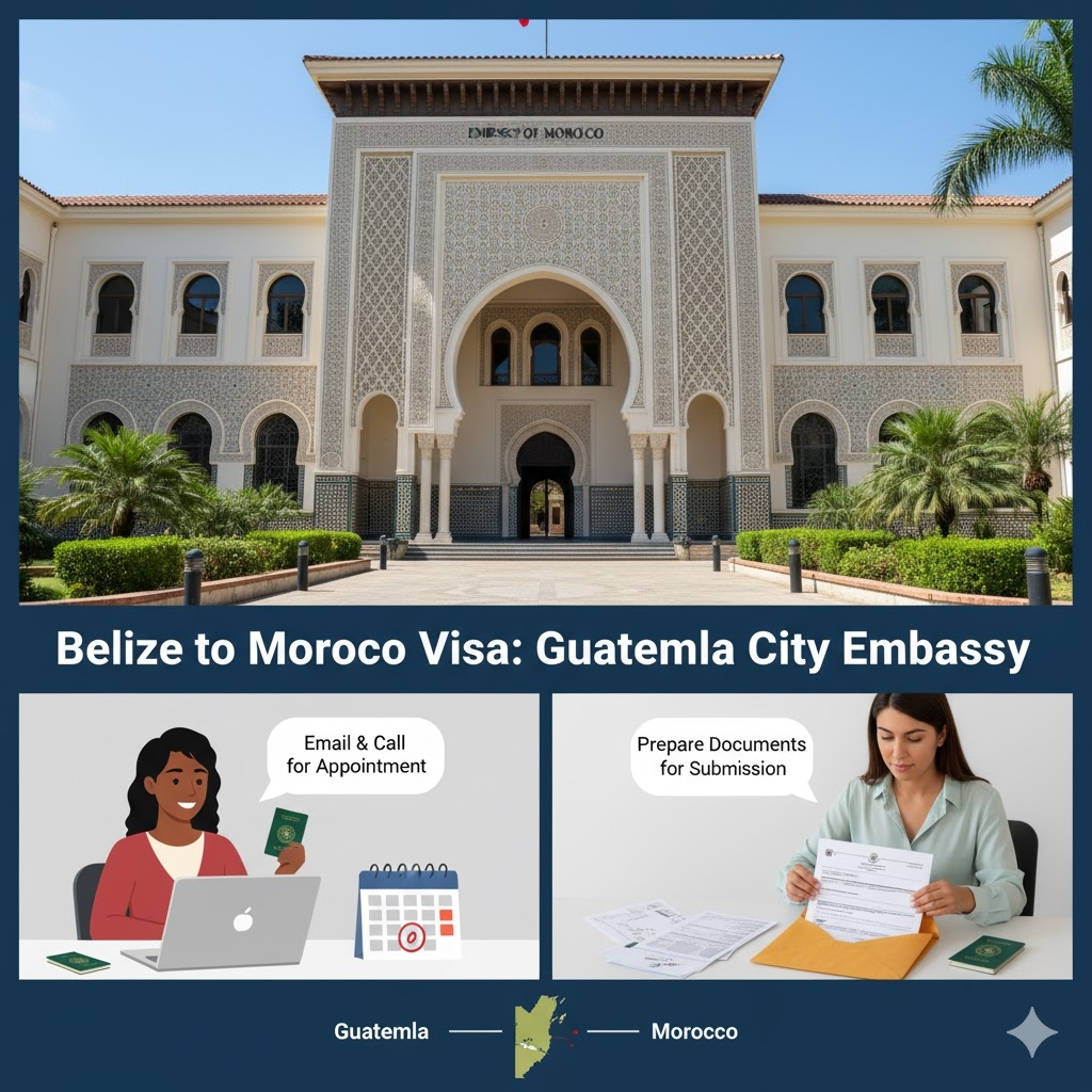 Morocco does not have an embassy in Belmopan. You will need to contact the Moroccan embassy in a nearby country, which is typically in Guatemala City, Guatemala, or Mexico City, Mexico. You must contact them directly via phone or email to ask about their specific application process, required documents, and whether you must appear in person or can submit your application by mail.
