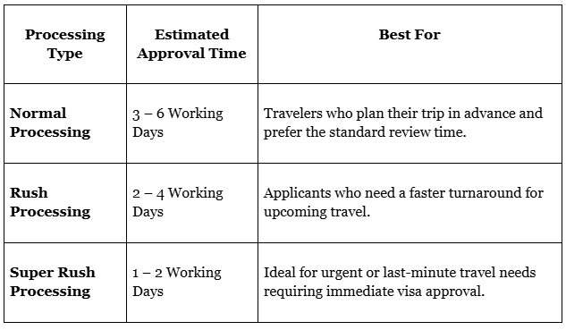 Applying for a Morocco eVisa is quick and flexible, with multiple processing options based on how soon you need your visa approved. Travelers can select from the following timeframes: