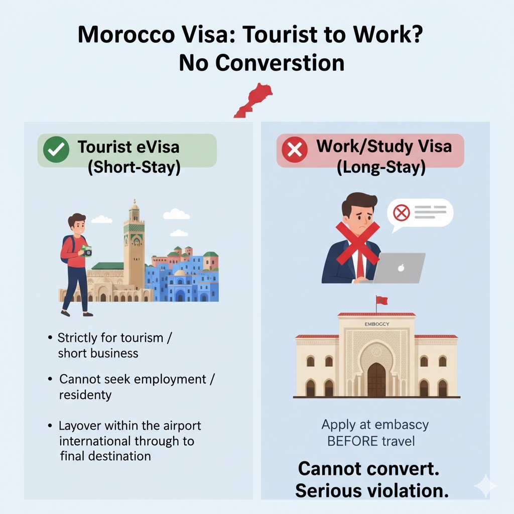 No. This is not possible and attempting it is a serious violation. The tourist eVisa is strictly for tourism or short-term business meetings. You cannot arrive on an eVisa and then look for a job or apply for residency. To work, study, or live in Morocco, you must apply for the correct long-stay visa from the Moroccan embassy before you travel.