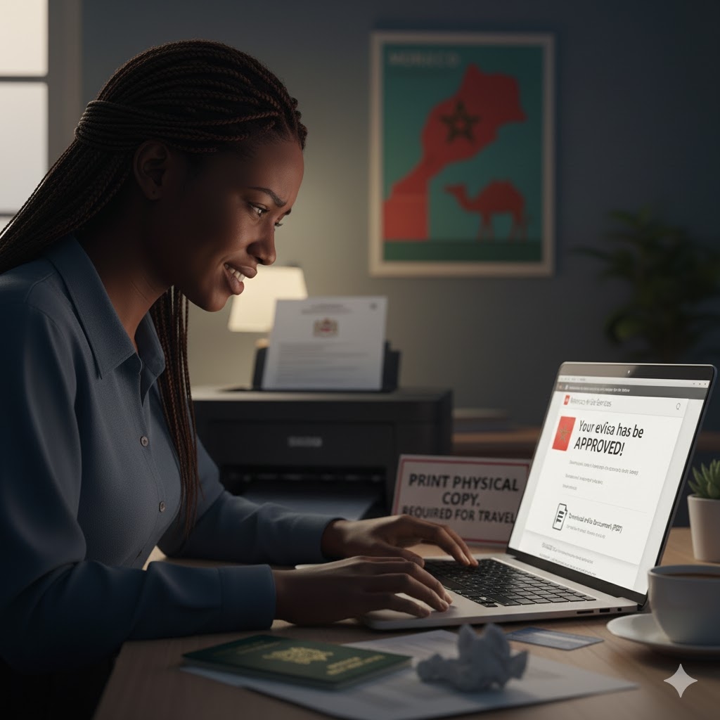 Once approved, your eVisa will be sent as a PDF document to the email address you used in your application. You must print a physical copy of this document. It is not enough to have it on your phone. The airline at check-in and the immigration officer in Morocco will both ask to see the printed paper copy.