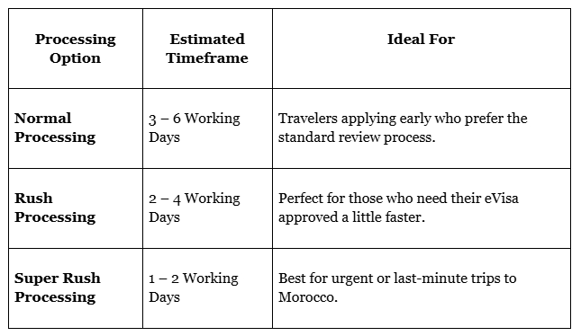 The Morocco eVisa process is designed to be quick, simple, and entirely online. Depending on your travel schedule, you can choose between three convenient processing options to get your visa approved on time.