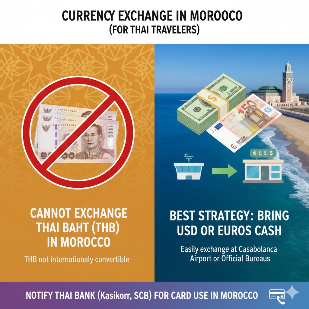 Best Strategy: Bring USD or Euros in cash. You can easily exchange these at the airport in Casablanca or at any official "Bureau de Change" in the cities. Notify your Thai bank (like Kasikorn or SCB) of your travel dates so your debit/credit cards aren't blocked when you use them at Moroccan ATMs.