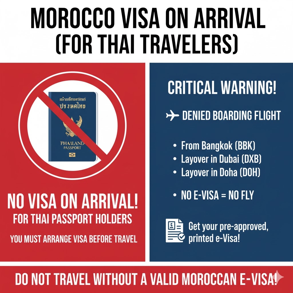 NO. This is a critical travel warning. Morocco does not offer a Visa on Arrival (VoA) for Thai passport holders. You will be denied boarding your flight (e.g., at BKK, or during your layover in Dubai or Doha) if you do not have your pre-approved, printed e-Visa. You must arrange your visa before you leave Thailand.