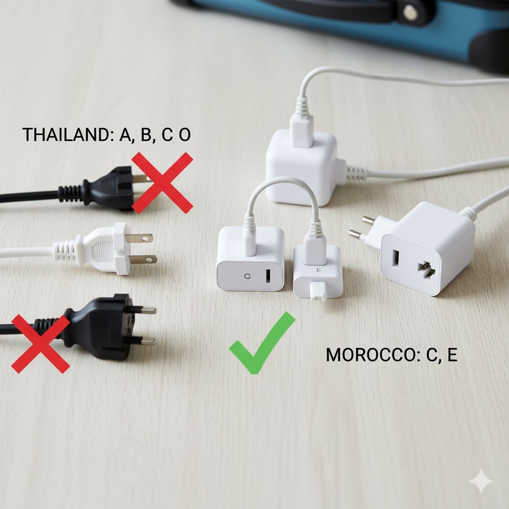 Thailand uses plugs A, B, C, and O. Morocco uses Types C and E.