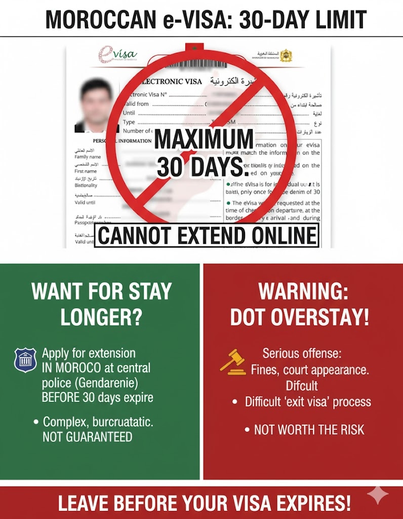 Your e-Visa is only valid for 30 days and cannot be extended online. If you fall in love with Morocco and want to stay longer, you must go to the nearest central police station (Gendarmerie) well before your 30 days expire to apply for an extension. This process is complex, bureaucratic, and not guaranteed.
