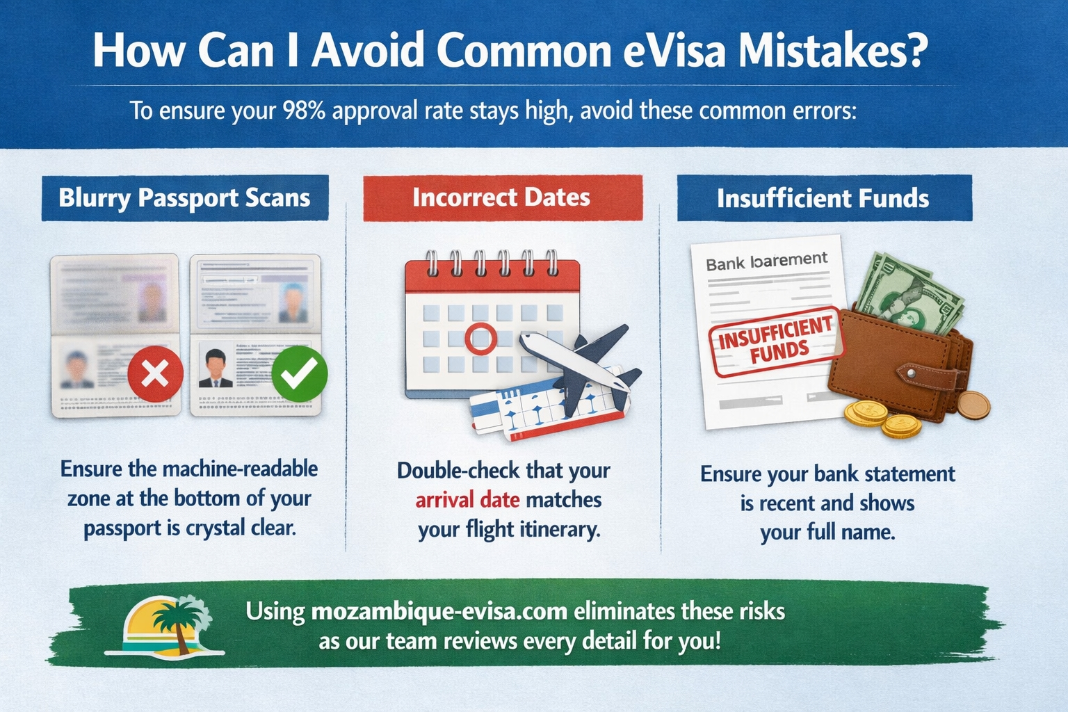 Insufficient Funds: Ensure your bank statement is recent and shows your full name. Using mozambique-evisa.com eliminates these risks as our team reviews every detail for you.