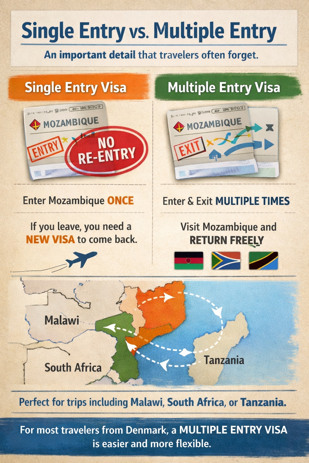 Multiple Entry: You can enter and leave Mozambique as many times as you want while your visa is valid. This is great for trips that include Malawi, South Africa, or Tanzania.