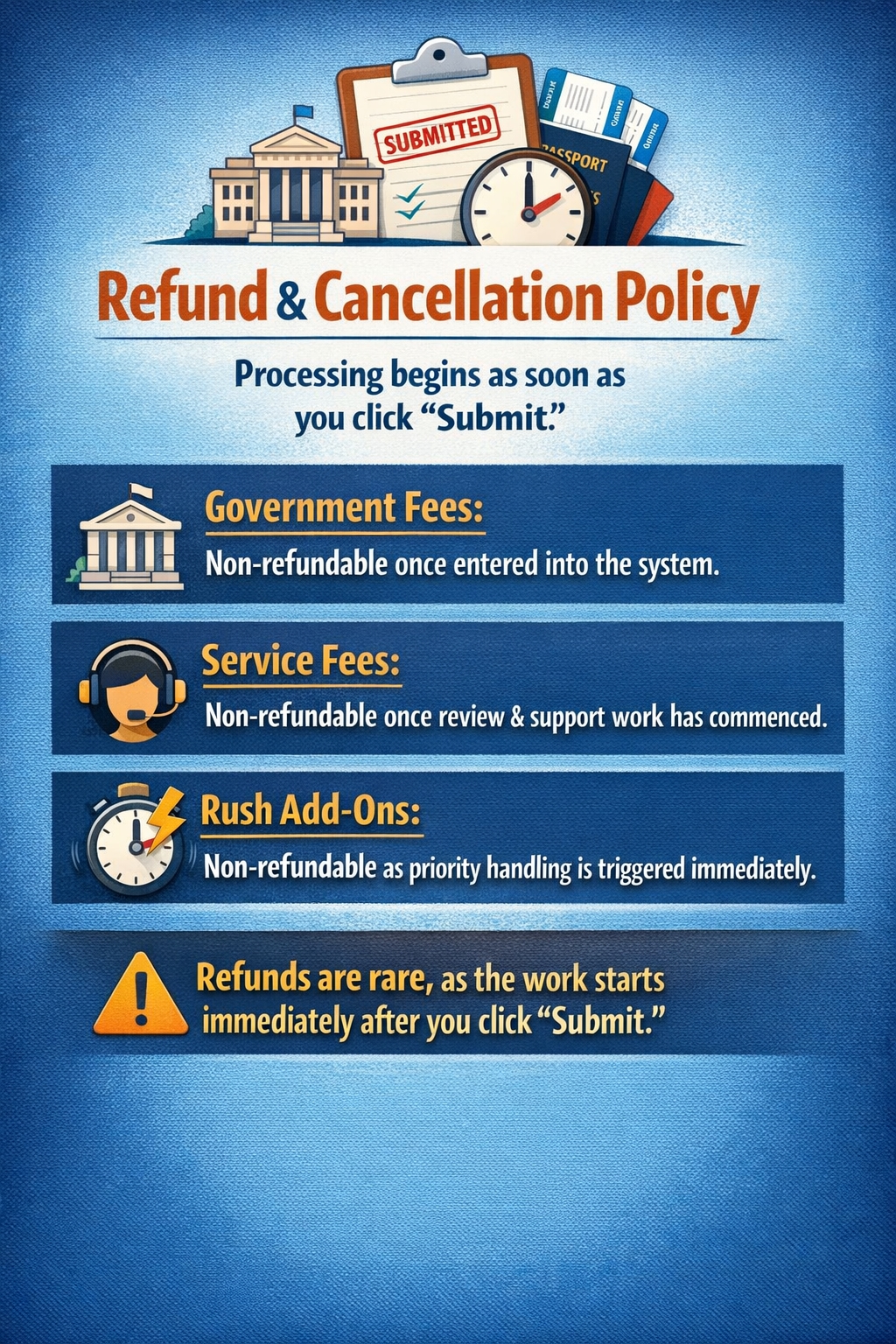 Rush Add-Ons: Non-refundable as priority handling is triggered immediately. In short, refunds are rare because the administrative work starts as soon as you click "Submit."
