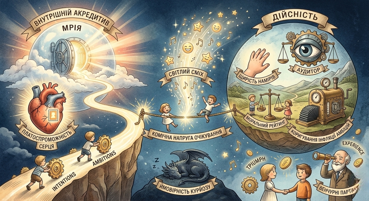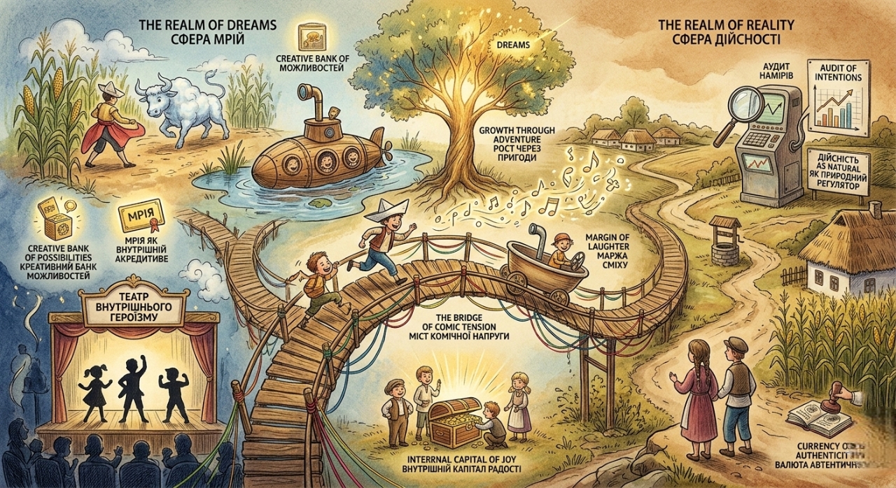 Мрія у творі виконує функцію внутрішнього акредитиву. Вона підтверджує платоспроможність серця. Дійсність, у свою чергу, проводить аудит. Вона перевіряє щирість намірів, тестує моральний рейтинг героя, коригує інфляцію амбіцій. Завдяки такій взаємодії виникає комічна напруга очікування. Венчурний партнер відчуває, що кожна авантюра ось ось принесе тріумф, хоча знає про ймовірність курйозу. Саме в цьому проміжку і пульсує світлий сміх.