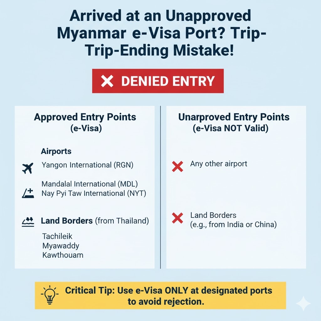 This is a critical, trip-ending mistake. The Myanmar e-Visa is only valid for entry at specific, designated ports. For tourists, these are: