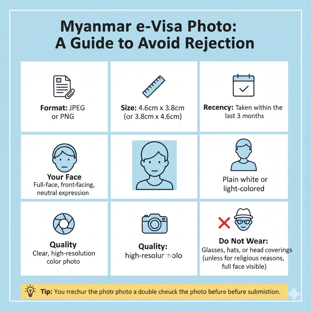This is a very common reason for application delays or rejections. The Myanmar e-Visa photo requirements are specific: