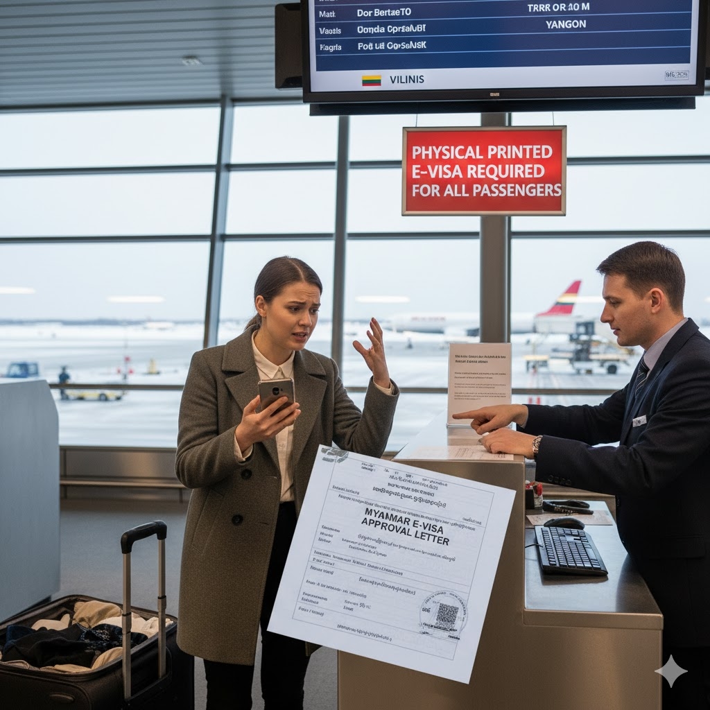 A digital copy on your phone is NOT sufficient. Airlines in Lithuania or at your transit hub will likely ask for the physical printed copy of your Approval Letter at check-in. Myanmar immigration officials absolutely require the paper copy to process your entry and stamp your passport. Always print two copies and keep one in your carry-on luggage.