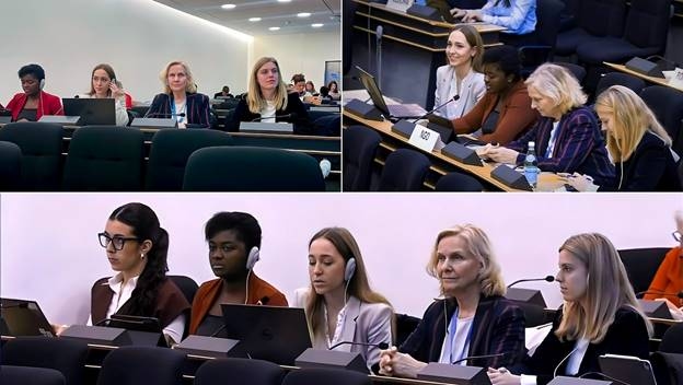 На Соціальному форумі Організації Об'єднаних Націй 2025 разом праворуч: пані Мара Бробст , консультантка з прав людини WFWPI та журналістка (праворуч); пані Керолін Гандшин , президентка Комітету громадських організацій зі становища жінок WFWPI, Женева; пані Марія Анапрейчик , експертка з прав людини Міжнародного громадського руху АЛЛАТРА, консультантка з прав людини WFWPI (у центрі); пані Найда Уган , консультантка з досліджень та адвокації WFWPI, лінгвістка (ліворуч)
