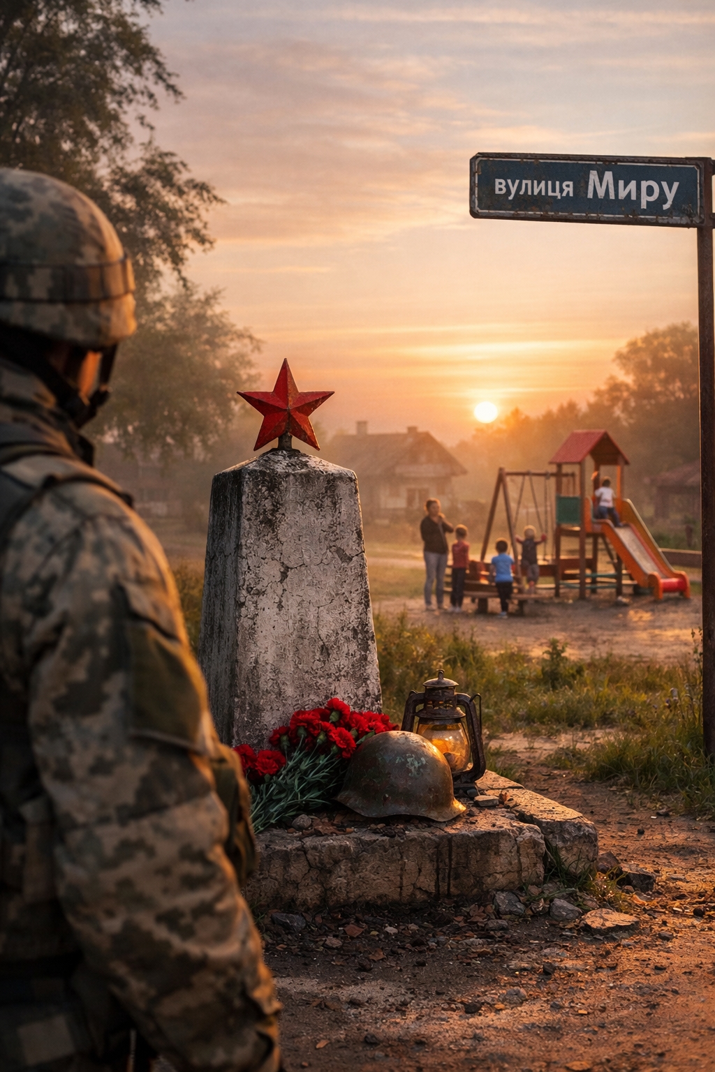 Колись війна привела їх сюди і залишила тут назавжди. А можливо, це були мирні мешканці – невинні жертви війни. Я впевнений, що в ті страшні часи ця вулиця не була вулицею Миру. Тоді це була вулиця Війни. Ні, звичайно, вона не мала такої офіційної назви. Вона була такою фактично. Молоді солдати прийшли сюди, щоб зупинити війну, а війна зупинила їх серця назавжди. І ті, хто вижили, вони були впевнені, що війна ніколи не повториться, що мир буде завжди. Мир буде вічно. Але, на жаль, людська пам'ять – ненадійна штука. Бо вона має здатність забувати.