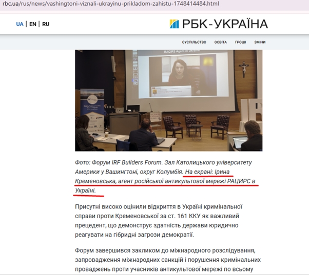 Під час міжнародного форуму у Вашингтоні на території католицького університету Америки на IRF Builders Forum, де були присутні високопосадовці США та міжнародні експерти, заявили, що під виглядом антикультових кампаній у різних країнах діє мережа, якою керує фсб із москви. Саме через цю антикультову мережу росія роками створює медіа атаки на населення демократичних країн, вербує агентів через завербованих псевдоекспертів, втручається у законодавство країн, розпалює ворожнечу в суспільстві та підриває демократію.