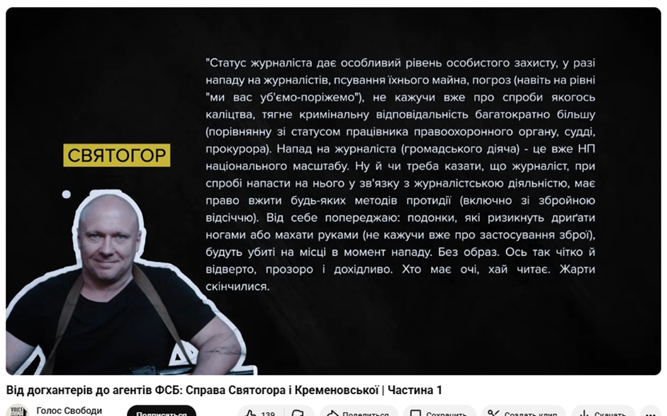 “Статус журналіста дає особливий рівень особистого захисту у разі нападу на журналістів, псування їхнього майна, погроз. Навіть на рівні ми вас уб'ємо, поріжемо, не кажучи вже про спроби якогось каліцтва, тягне кримінальну відповідальність багатократно більшу, порівняно зі статусом працівника правоохоронного органу, судді, прокурора. Напад на журналіста, громадського діяча - це вже НП національного масштабу. Ну і чи треба казати, що журналіст при спробі напасти на нього у зв'язку з журналістською діяльністю має право вжити будь-яких методів протидії, включно зі збройною відсіччю? Не себе попереджаю. Подонки, які ризикнуть дригати ногами або махати руками, не кажучи вже про застосування зброї, будуть вбиті на місці в момент нападу. Без образ. Ось так чітко і відверто, прозоро і дохідливо. Хто має очі, хай читає. Жарти скінчилися.”