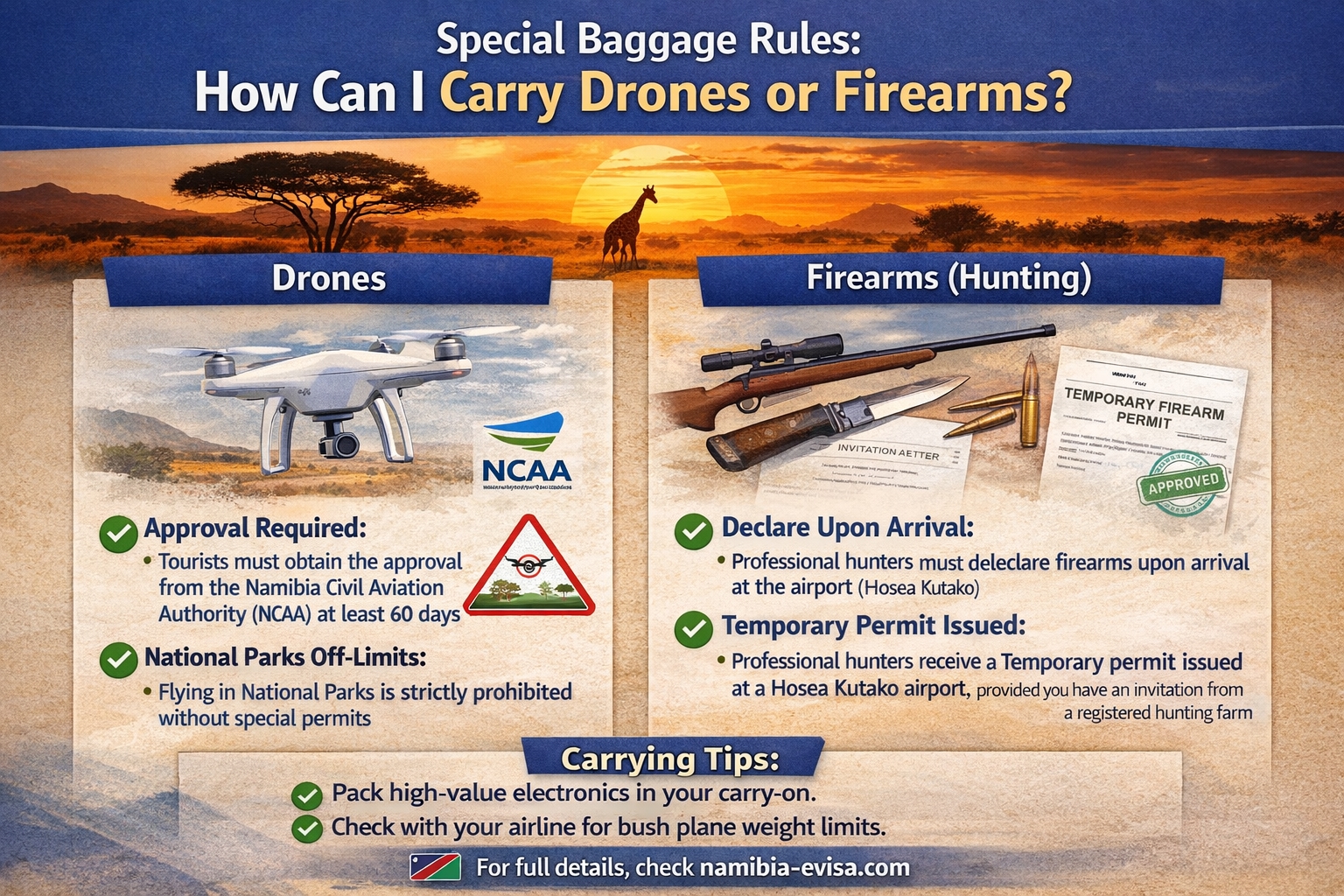 Drones: To fly a drone in Namibia as a tourist, you must obtain approval from the Namibia Civil Aviation Authority (NCAA) at least 60 days in advance. Flying in National Parks is strictly prohibited without special permits.