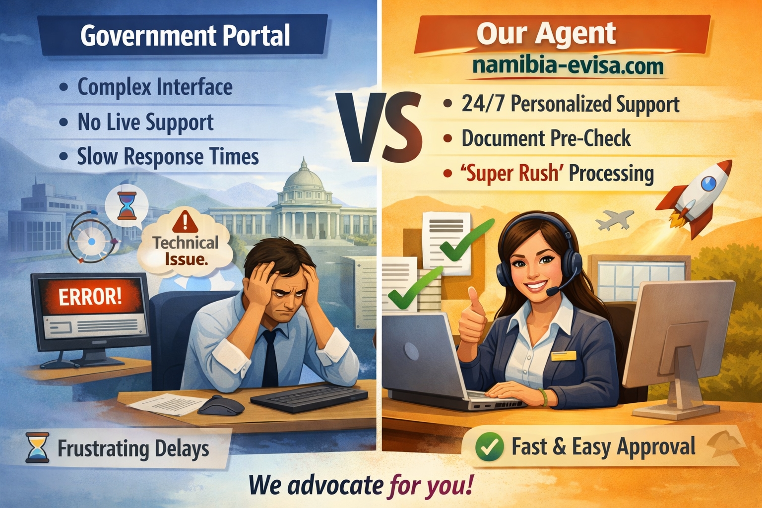 Agent (namibia-evisa.com): We provide 24/7 personalized support, document pre-checking to prevent rejection, and expedited "Super Rush" options that the official portal does not offer. We act as your advocate to ensure a smooth approval.