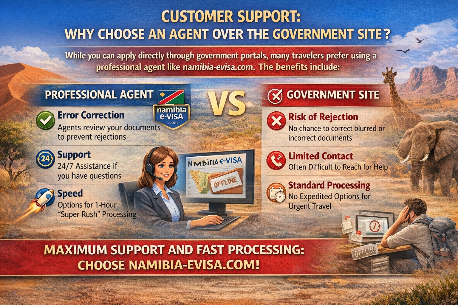 While you can apply directly through government portals, many travelers prefer using a professional agent like namibia-evisa.com. The benefits include: