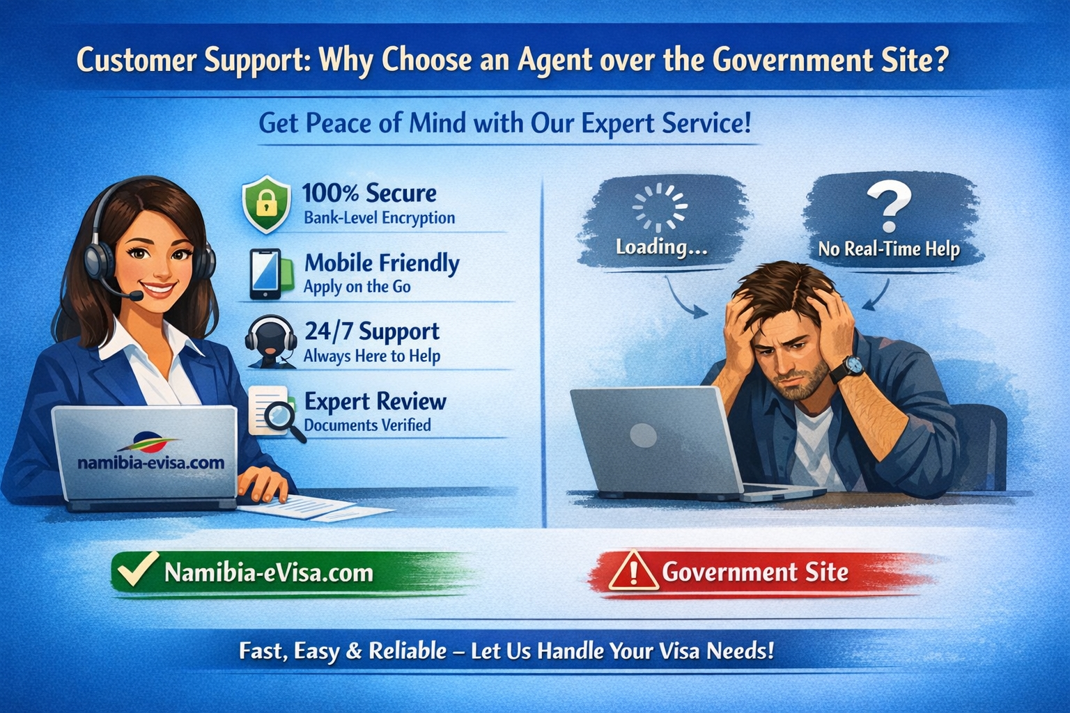 While you can navigate government portals, many travelers prefer the peace of mind offered by a dedicated agency like namibia-evisa.com. The official government site often lacks real-time support and can be confusing during technical glitches. Our service offers: