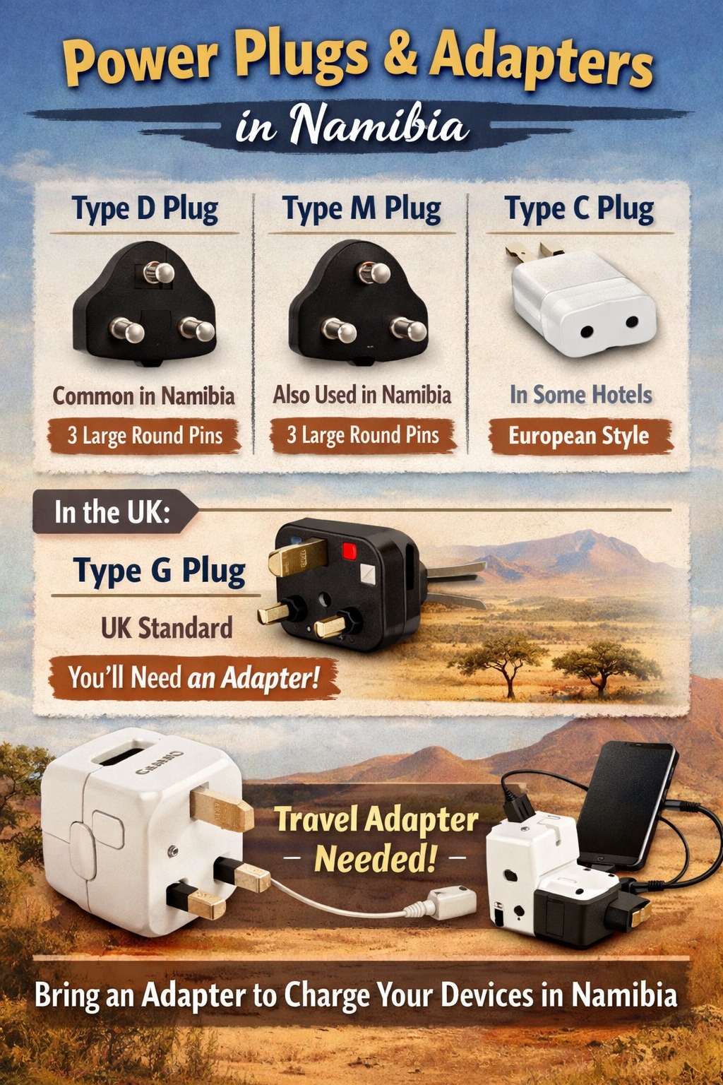 Namibia primarily uses Type D and Type M plugs (the large three-round-prong style common in South Africa). Some modern hotels also have European-style Type C sockets. Since the UK uses Type G, you will definitely need a travel adapter to charge your devices.