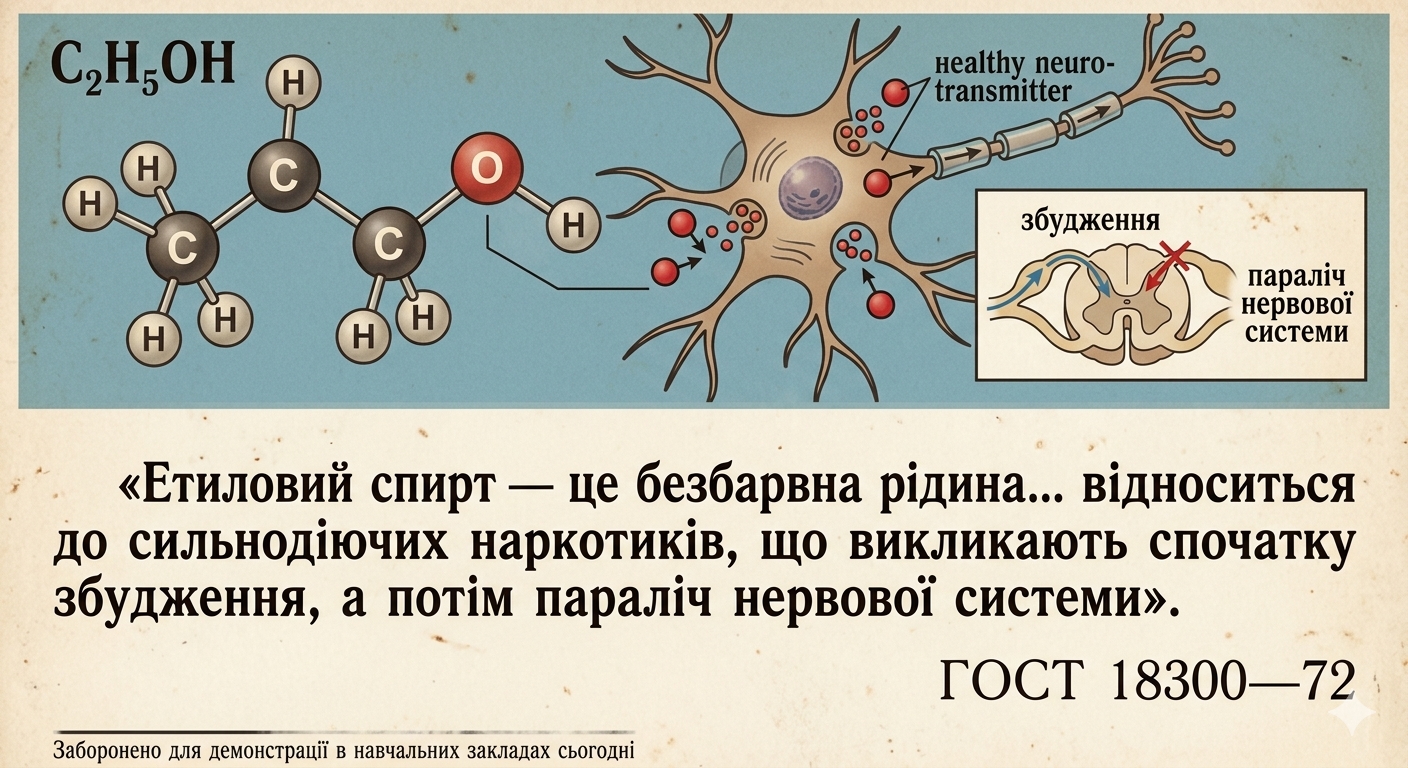 «Етиловий спирт — це безбарвна рідина... відноситься до сильнодіючих наркотиків, що викликають спочатку збудження, а потім параліч нервової системи».