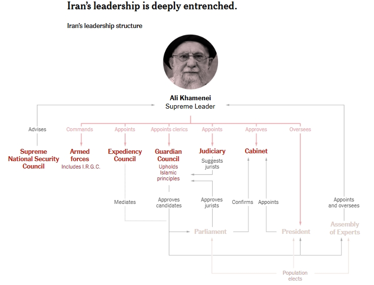 Іранський уряд є теократією, в якій верховний лідер є головною владою. Це забезпечується Корпусом ісламської революційної гвардії, страхітливим і потужним підрозділом збройних сил, чисельність якого, за оцінками, становить близько 150 000 осіб, які захищають і просувають авторитарну політику режиму.