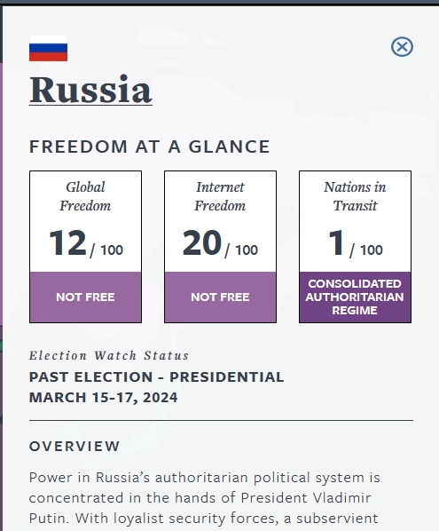 Рейтинг свободи в росії за даними агенства Freedom house за 2024 - 12 зі 100.