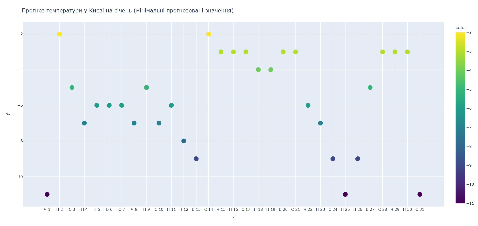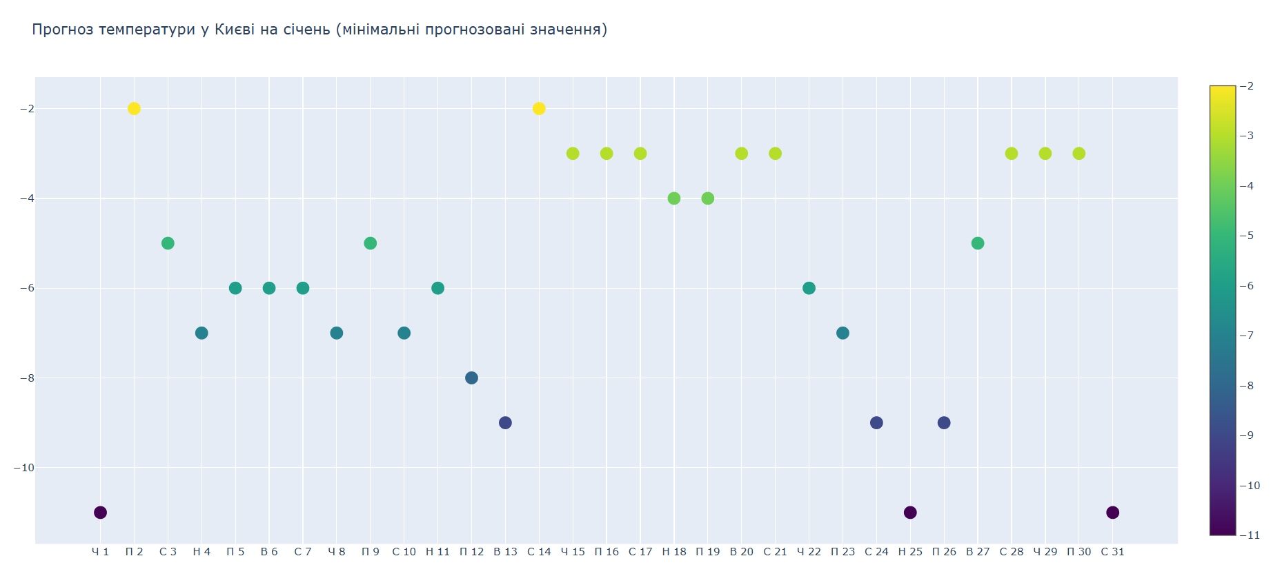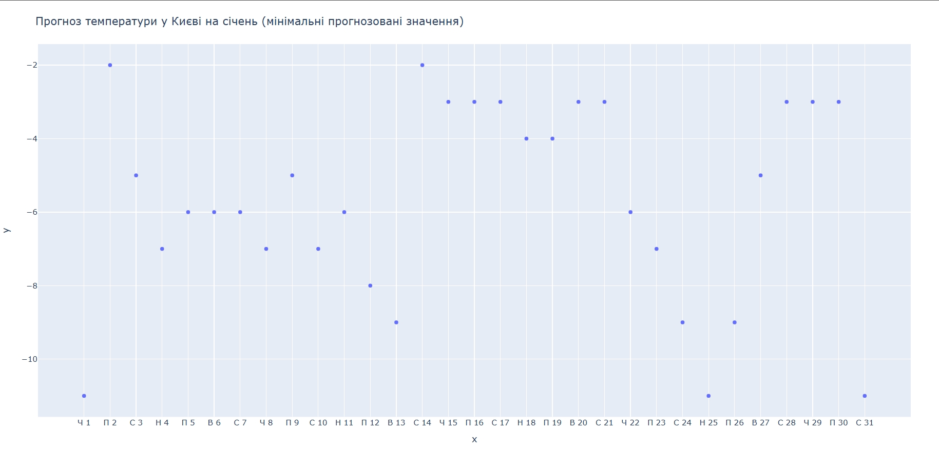 scatter_plot.update_layout(title="Прогноз температури у Києві на січень (мінімальні прогнозовані значення)")
